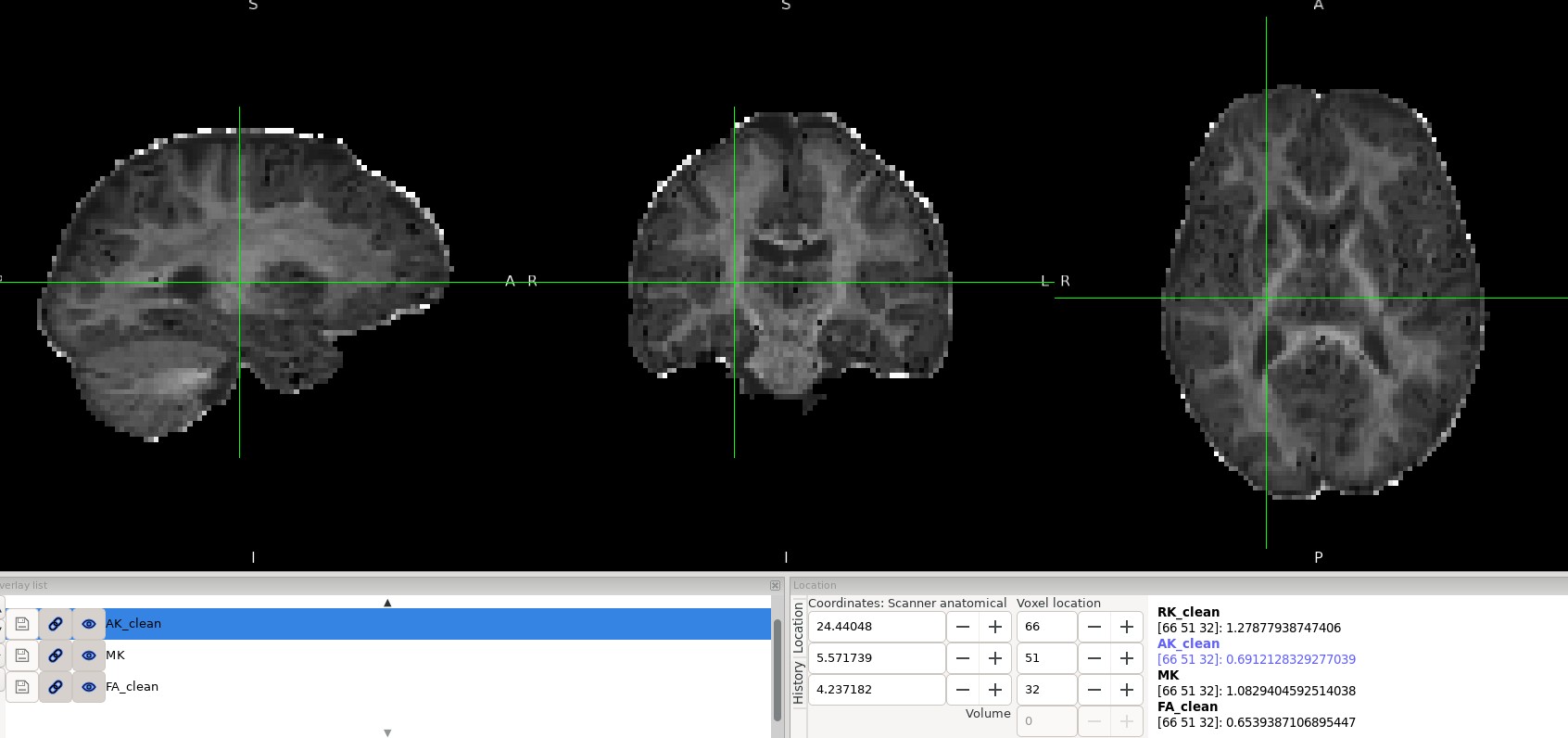 Overall, the results look reasonable; however, as shown in the image, there are a few black voxels, corresponding to values that are lower than expected, in the splenium and genu of the corpus callosum.