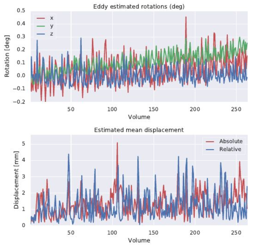 First, the images have stripes (possibly slice-wise translation due to multiband). After preprocessing, the eddy QC output graphs look strange to me. Below in the eddy estimated translation graph, the translation in “y” direction looks weird and also translation in the range of 8 mm (across multiple subjects, not just this one) seem too large. Also the stripes remain in the data after preprocessing. Below, I have also attached other graphs from eddy QC.