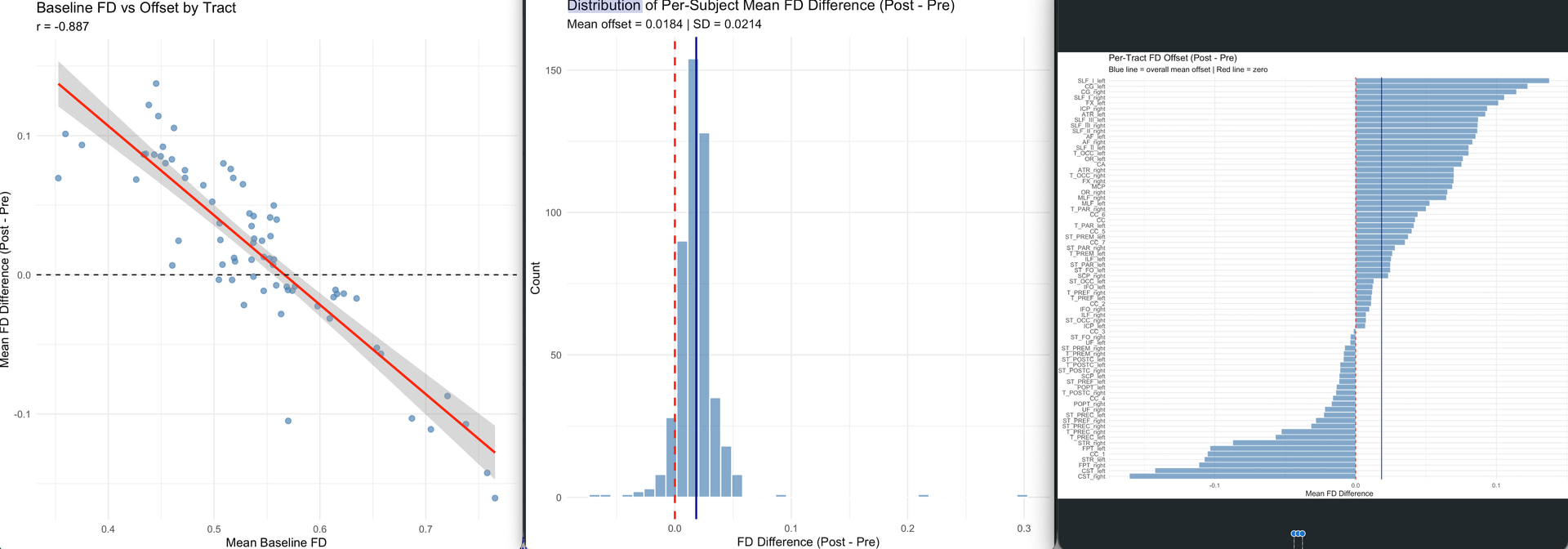 The problem: Post-intervention mean FD values are systematically ~0.1 higher than baseline across all subjects and tracts. The offset is not uniform, when I plot baseline tract-level mean FD against the offset (post minus pre), I get a strong negative correlation (r = −0.886, p < 2e-16). Tracts with lower baseline FD show larger increases, and tracts with higher baseline FD show smaller increases.